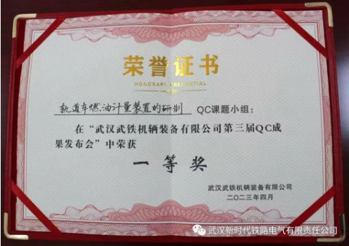 近日,我司与武汉武铁机辆装备有限公司联合研制的产品“轨道车燃油计量装置”在武汉武铁机辆装备有限公司第三届QC成果发布会中,荣获一等奖。